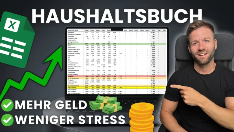 Ein Haushaltsbuch führst du am besten mit einer strukturierten Vorlage wie meiner Excel- oder Google Sheets-Vorlage. Erfasse alle Einnahmen und Ausgaben monatlich, ordne sie Kategorien zu und analysiere am Ende die Durchschnitte. Wichtig ist, wirklich alle Ausgaben zu erfassen – auch die kleinen Beträge. Eine Routine von 15 bis 30 Minuten pro Monat reicht völlig aus.